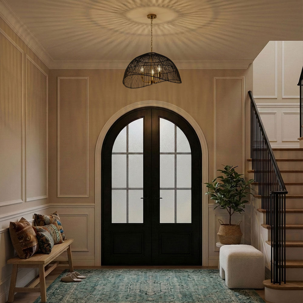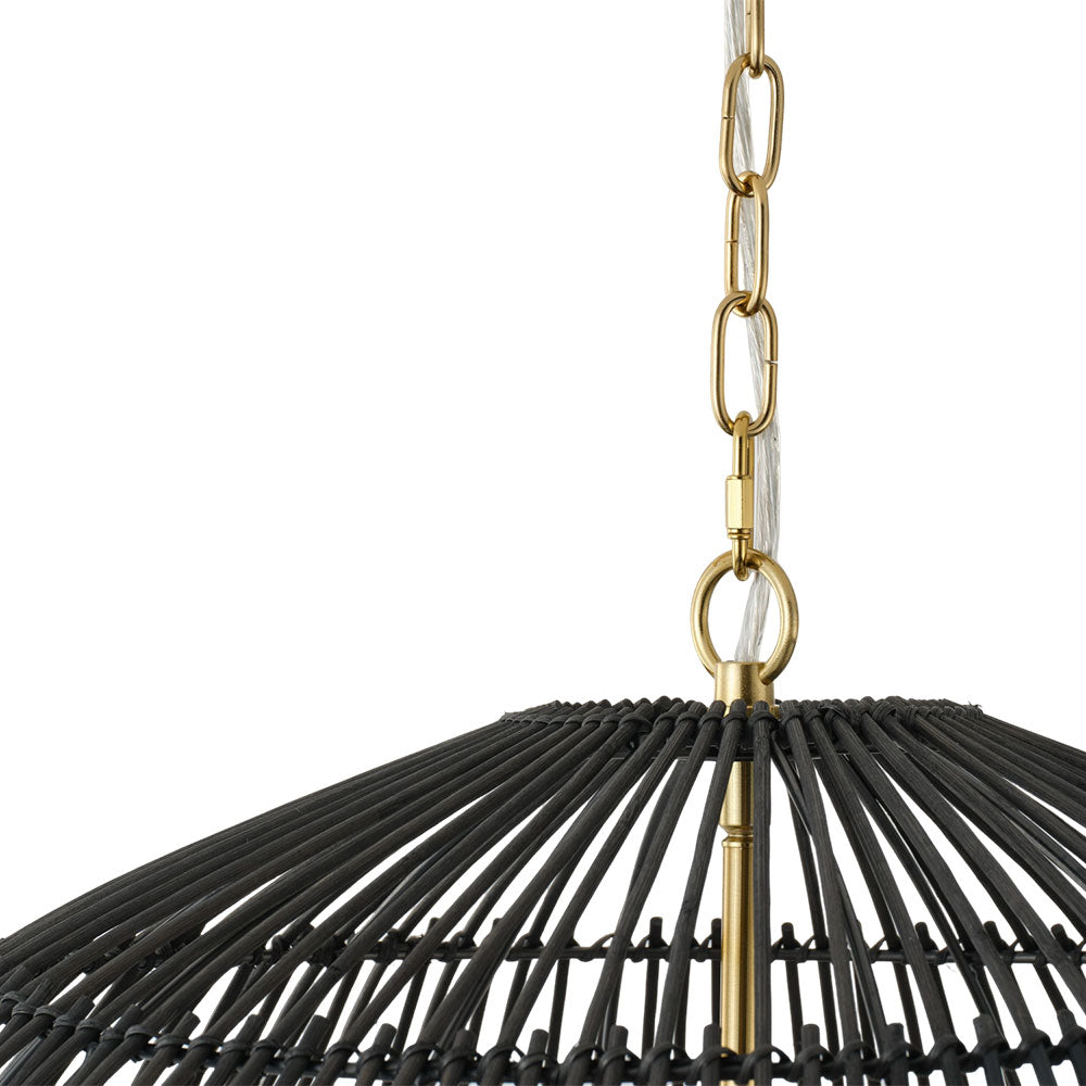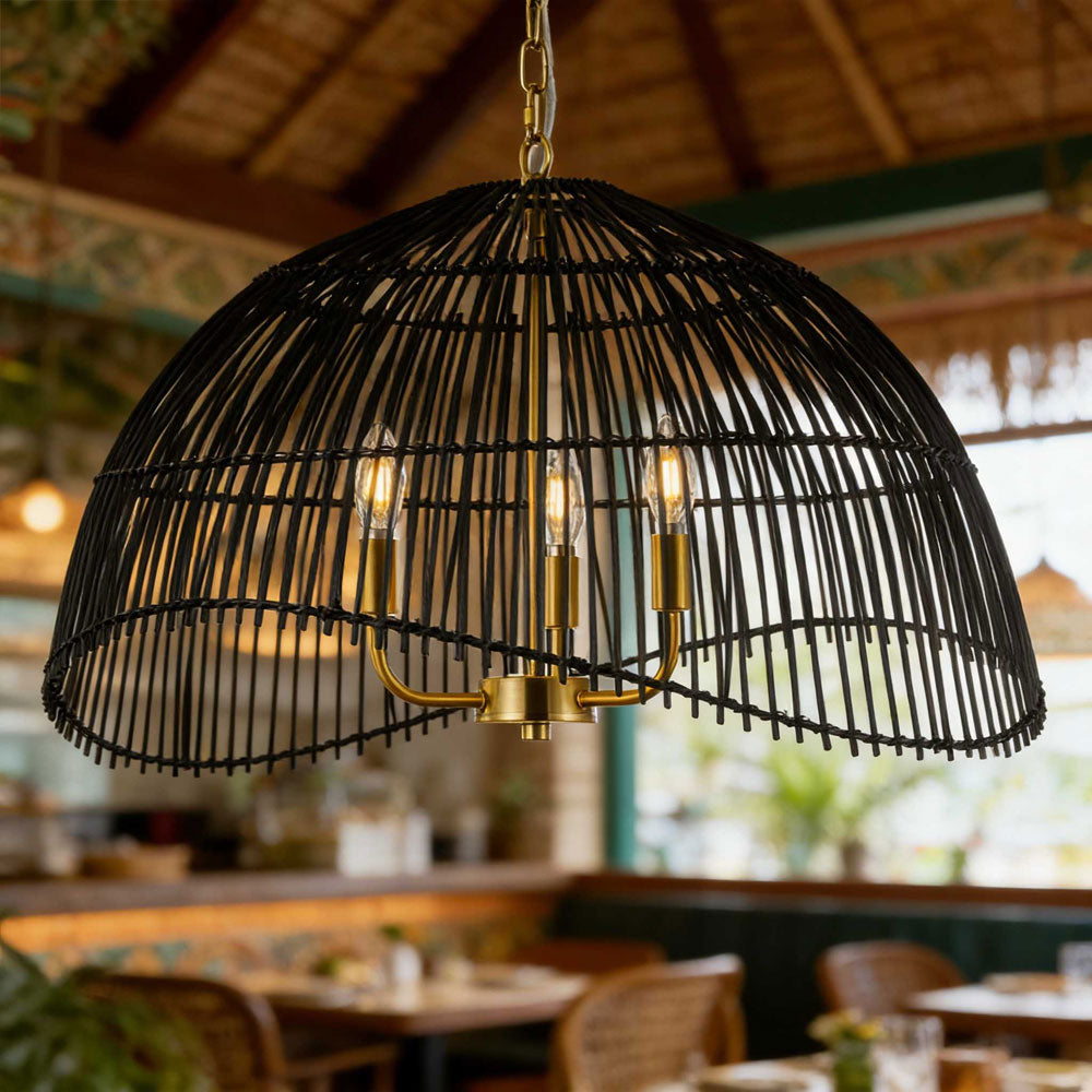 Black rattan dome shade with a mixed metal look. The warm brass tone finish and open dome shape create a clean statement style for modern farmhouse spaces.