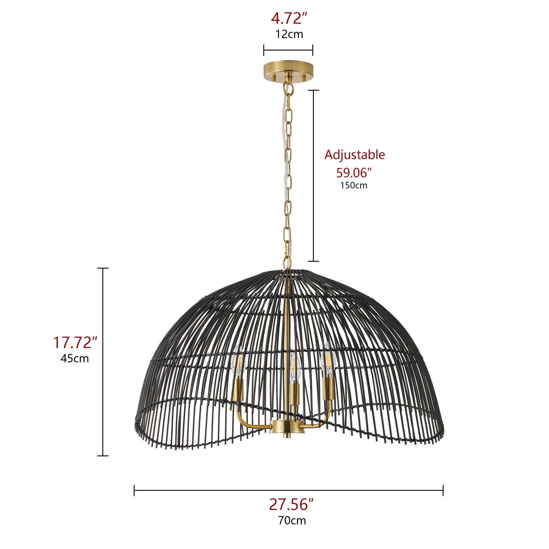 This farmhouse dome pendant light features a 3 light design with E12 bases 120V and 40W max per bulb. Iron body and iron canopy with brass color electroplated finish plus SVT 3 core main wire for stable performance.