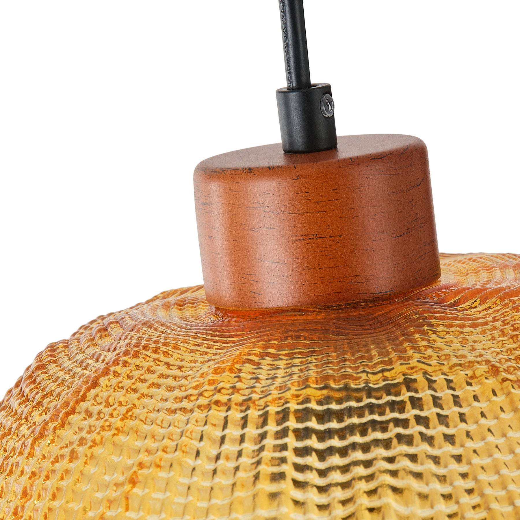 This pendant light features an iron body in matte black and faux wood grain with a warm amber glass shade. It uses one E26 120V 40W bulb and includes an SVT three-core wire. ETL certified for safe home use.