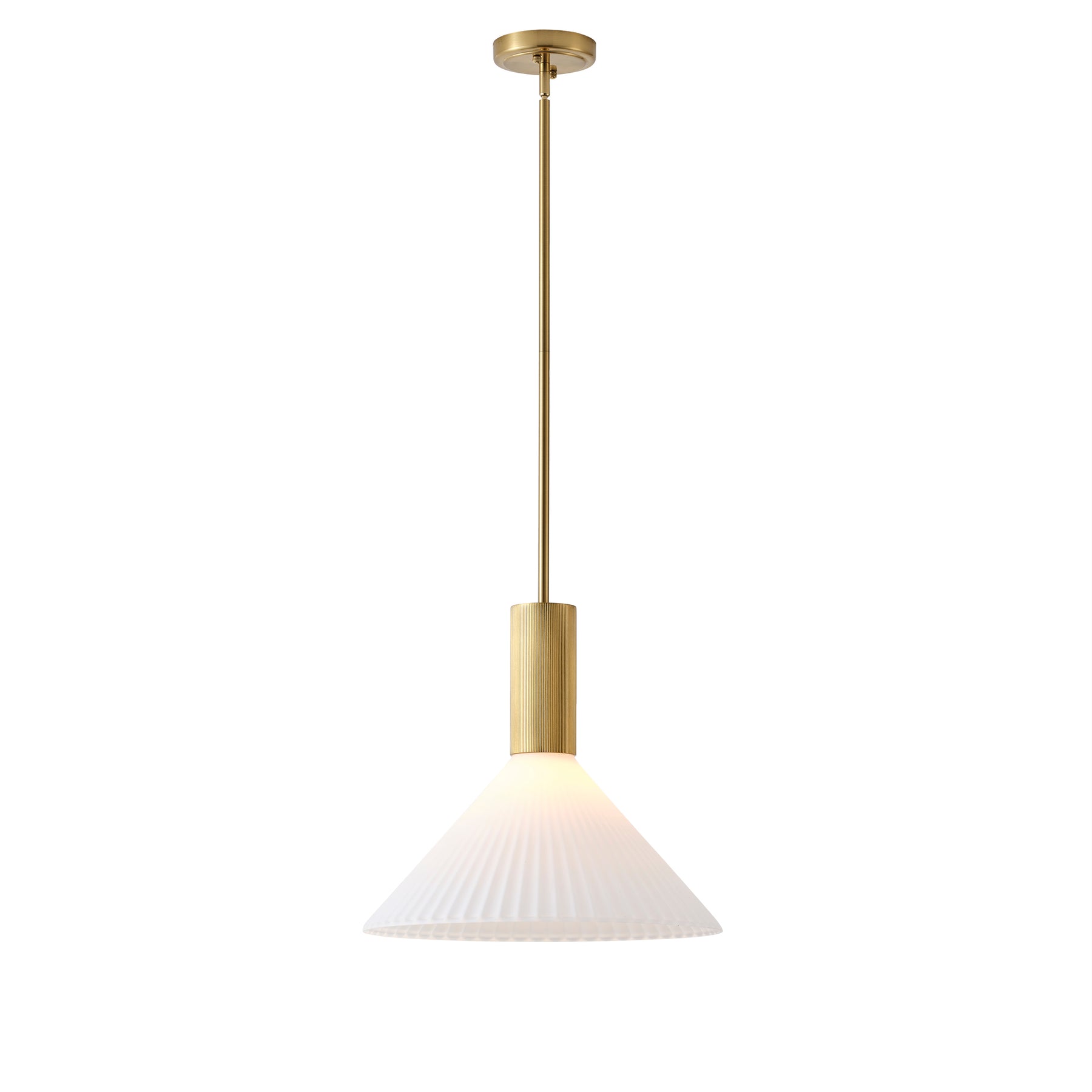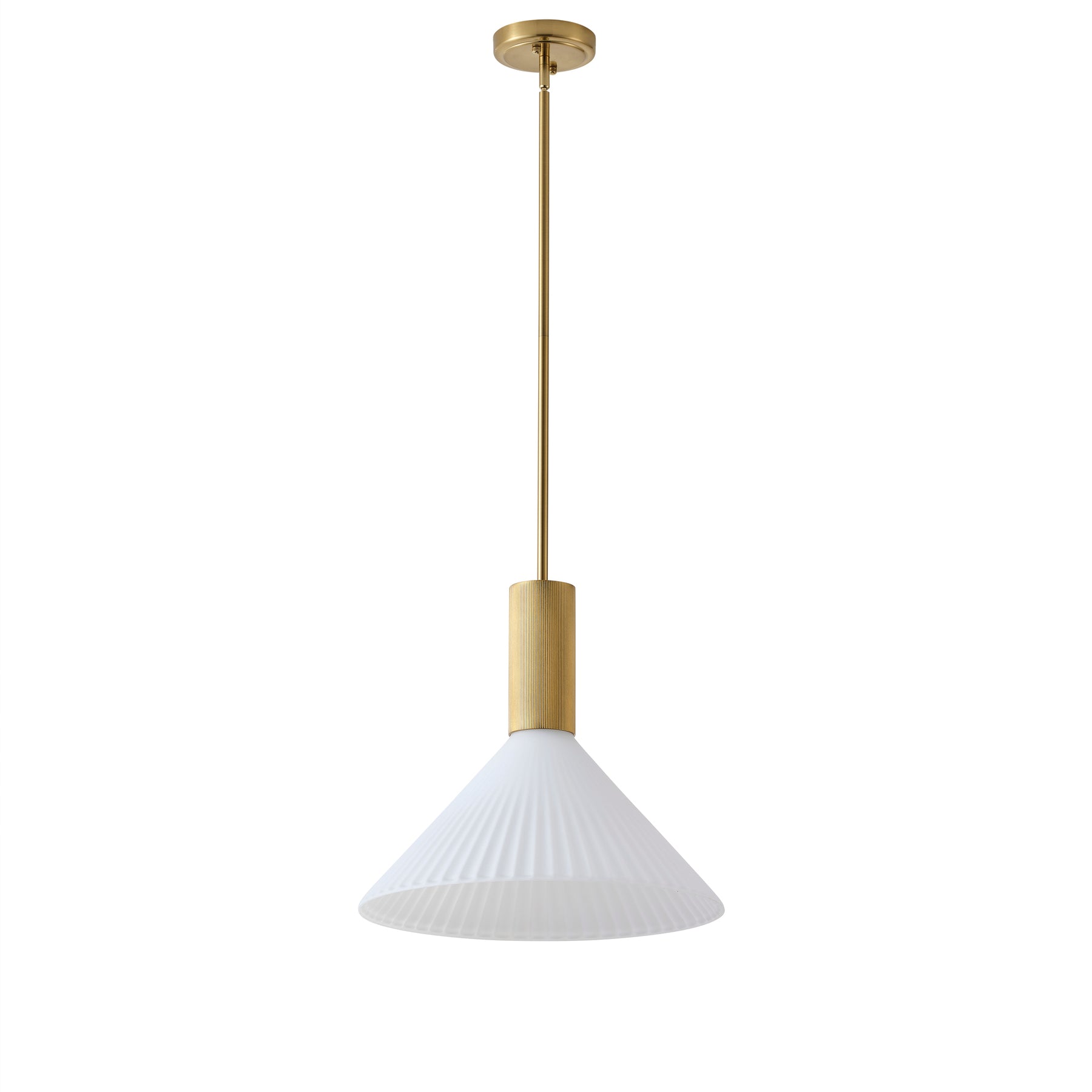This single-light mid-century modern pendant features a painted iron and aluminum body in matte black or gold. The shade is acidwashed white jade-style glass, paired with a matching painted iron canopy. Compatible with 1 x E26 bulb, 120V, max 60W. ETL listed for added safety.