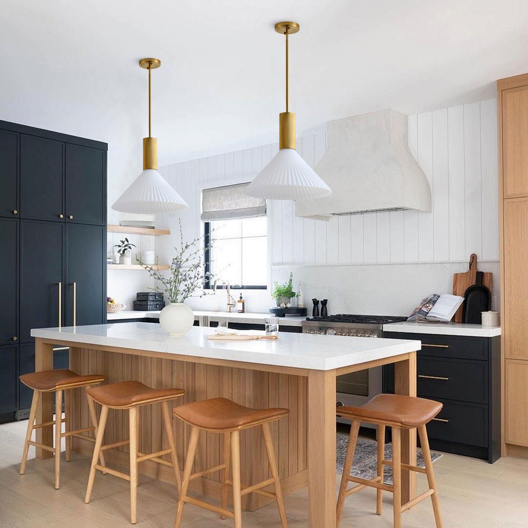 A trumpet-shaped, conical silhouette with clean lines creates a statement yet subtle look. The soft white acidwashed glass adds an elegant glow, while the matte black or gold finish keeps the design timeless and easy to match.
