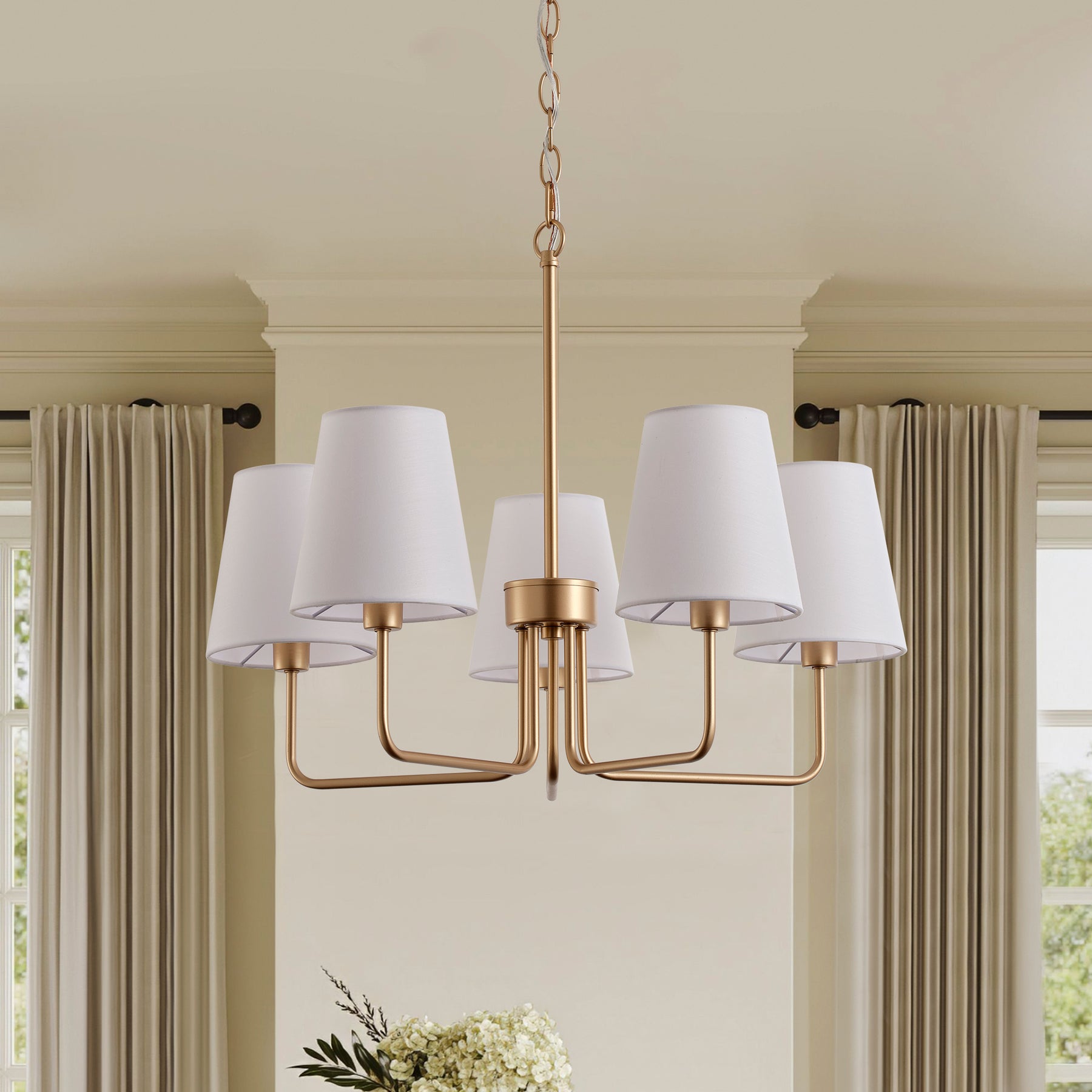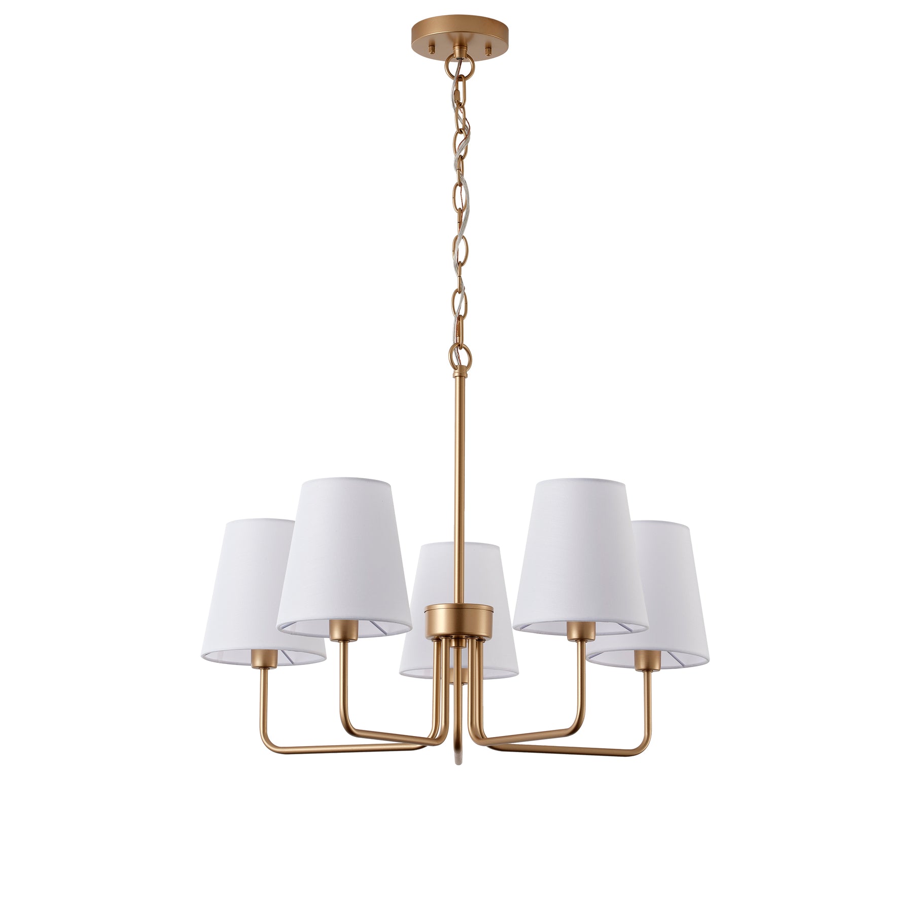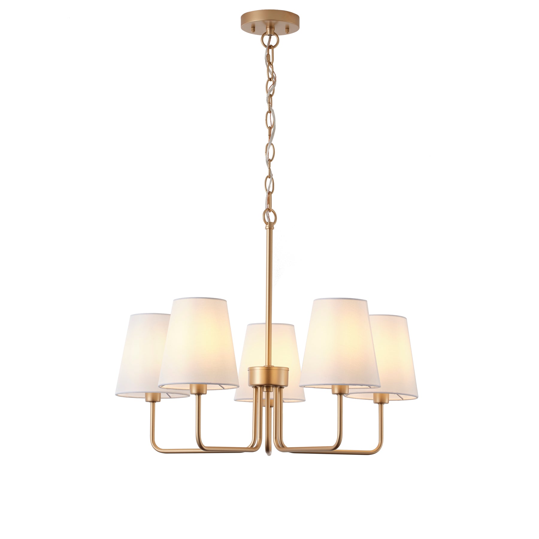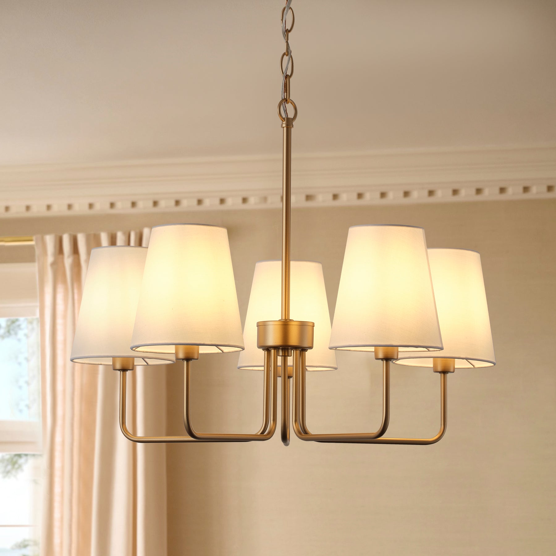 A clean multi light chandelier with five white tapered fabric shades that create soft downlight. The deep gold finish adds a warm modern touch that fits mid century and transitional spaces.