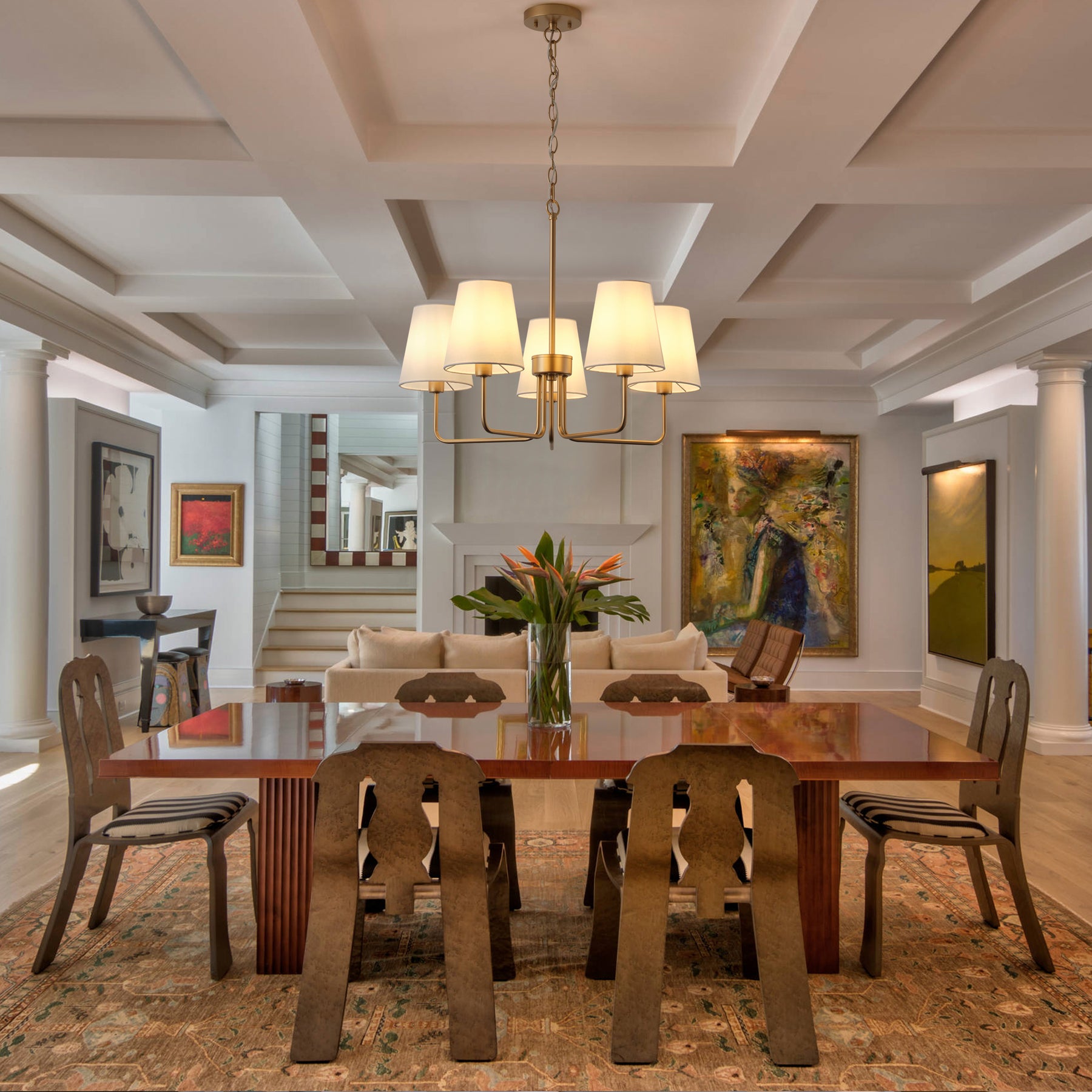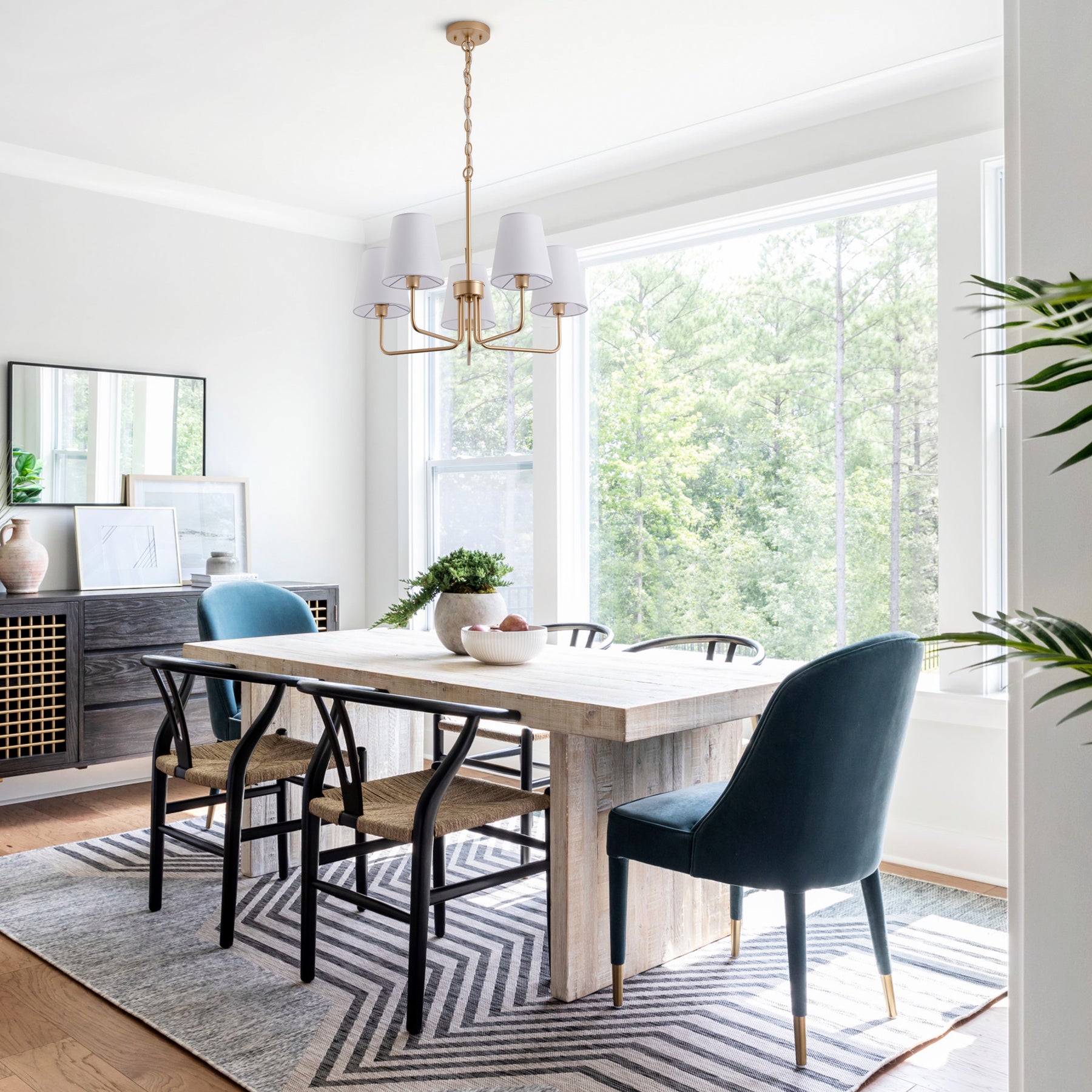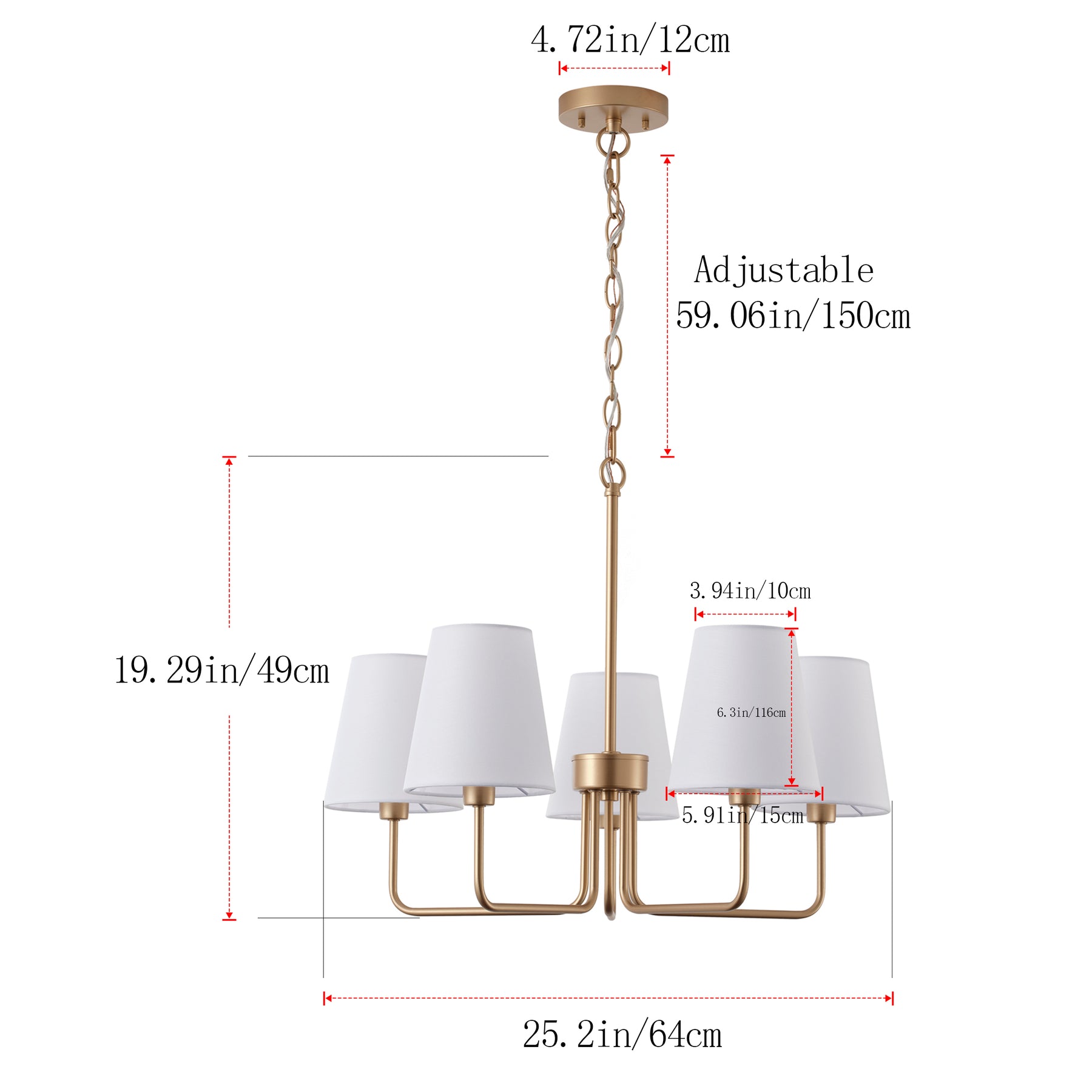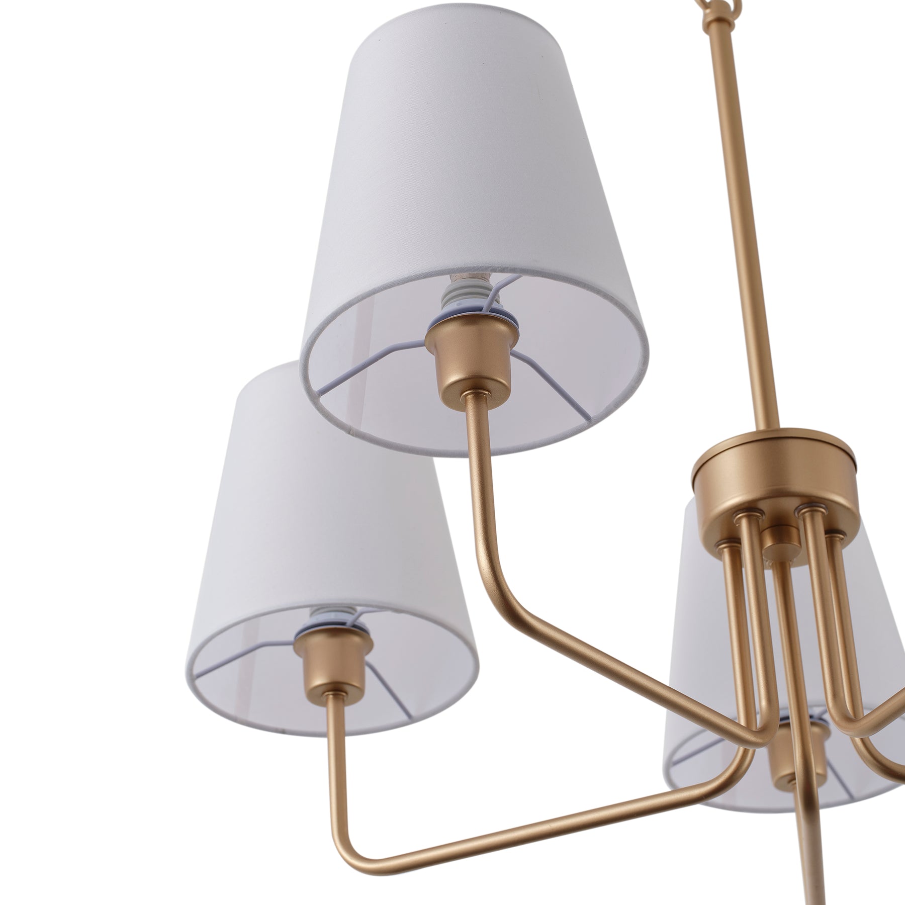 A clean multi light chandelier with five white tapered fabric shades that create soft downlight. The deep gold finish adds a warm modern touch that fits mid century and transitional spaces.