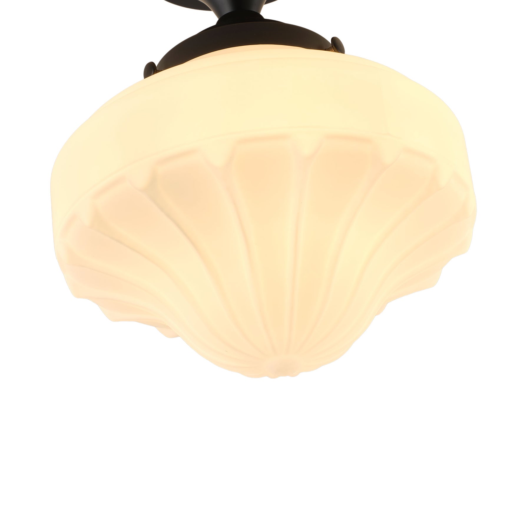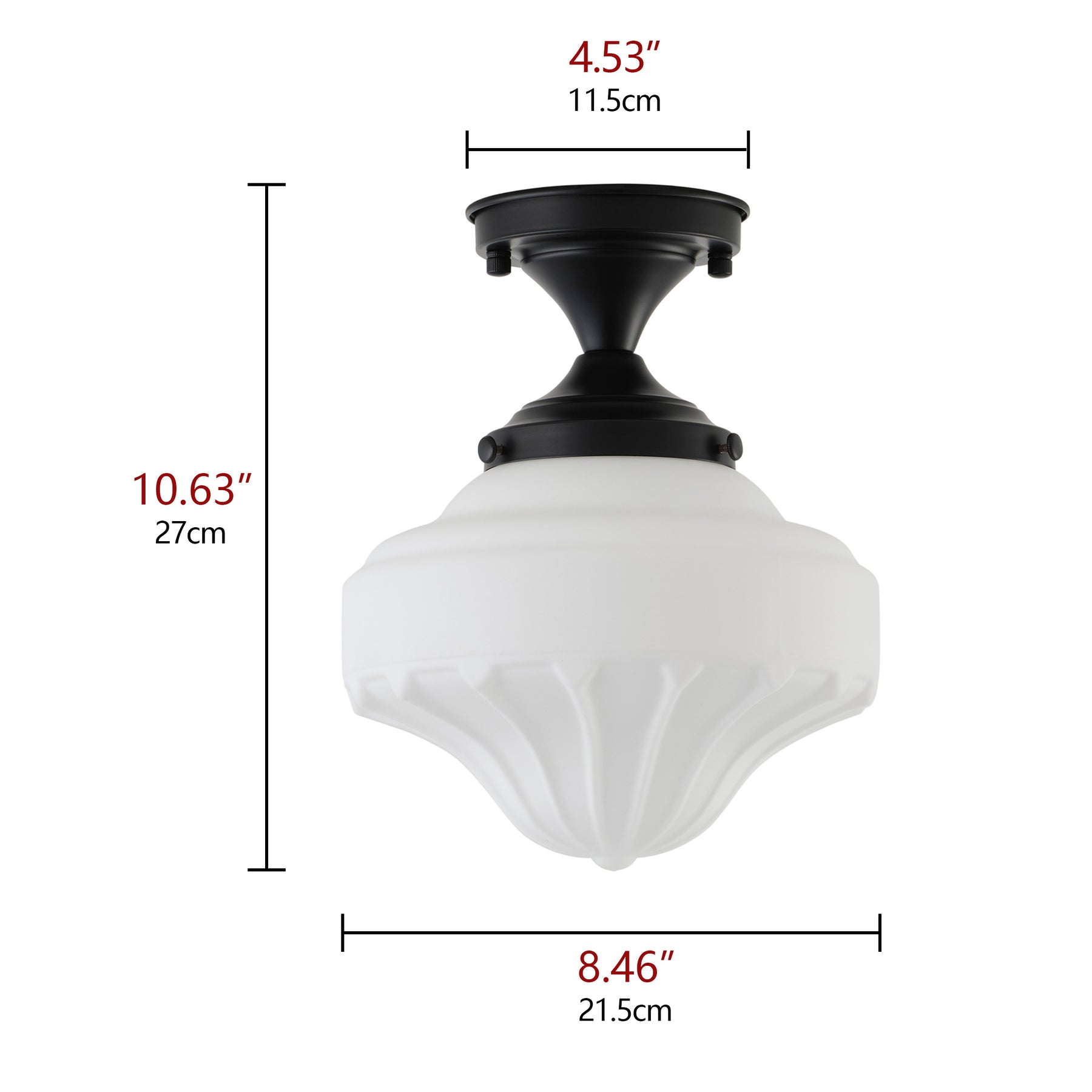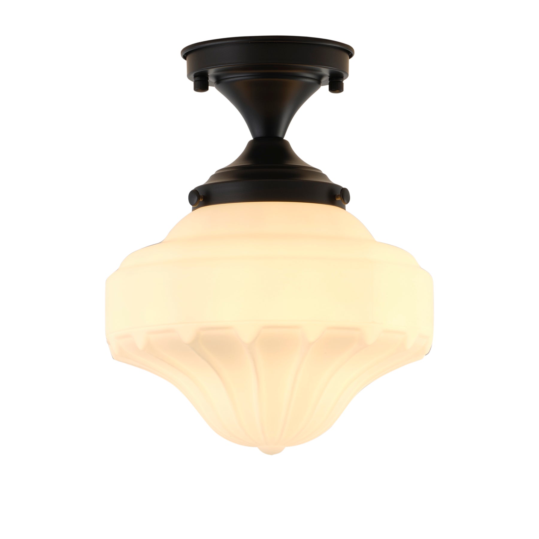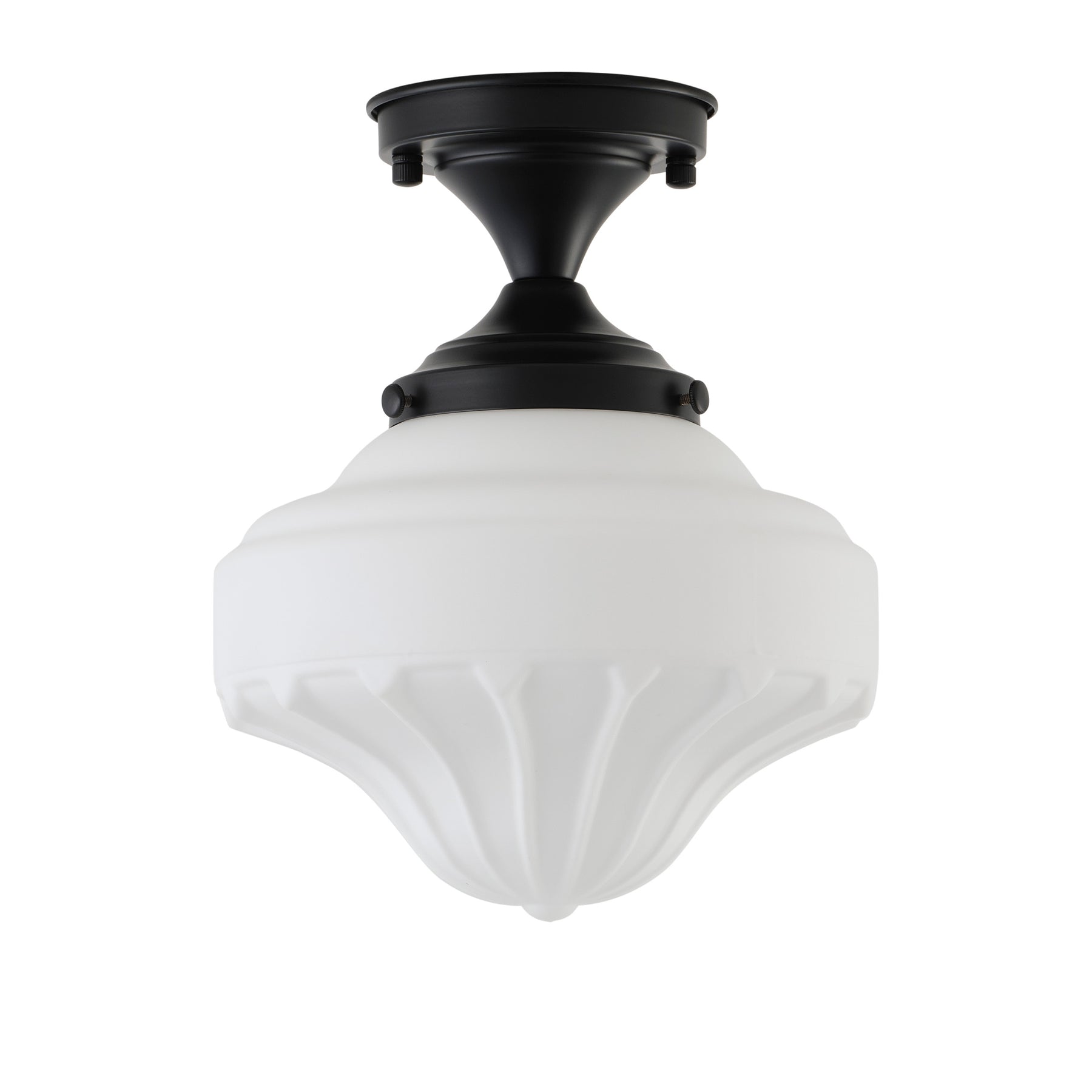 Vintage schoolhouse silhouette with a clean matte black top and soft white glass bowl shade for a classic timeless look.