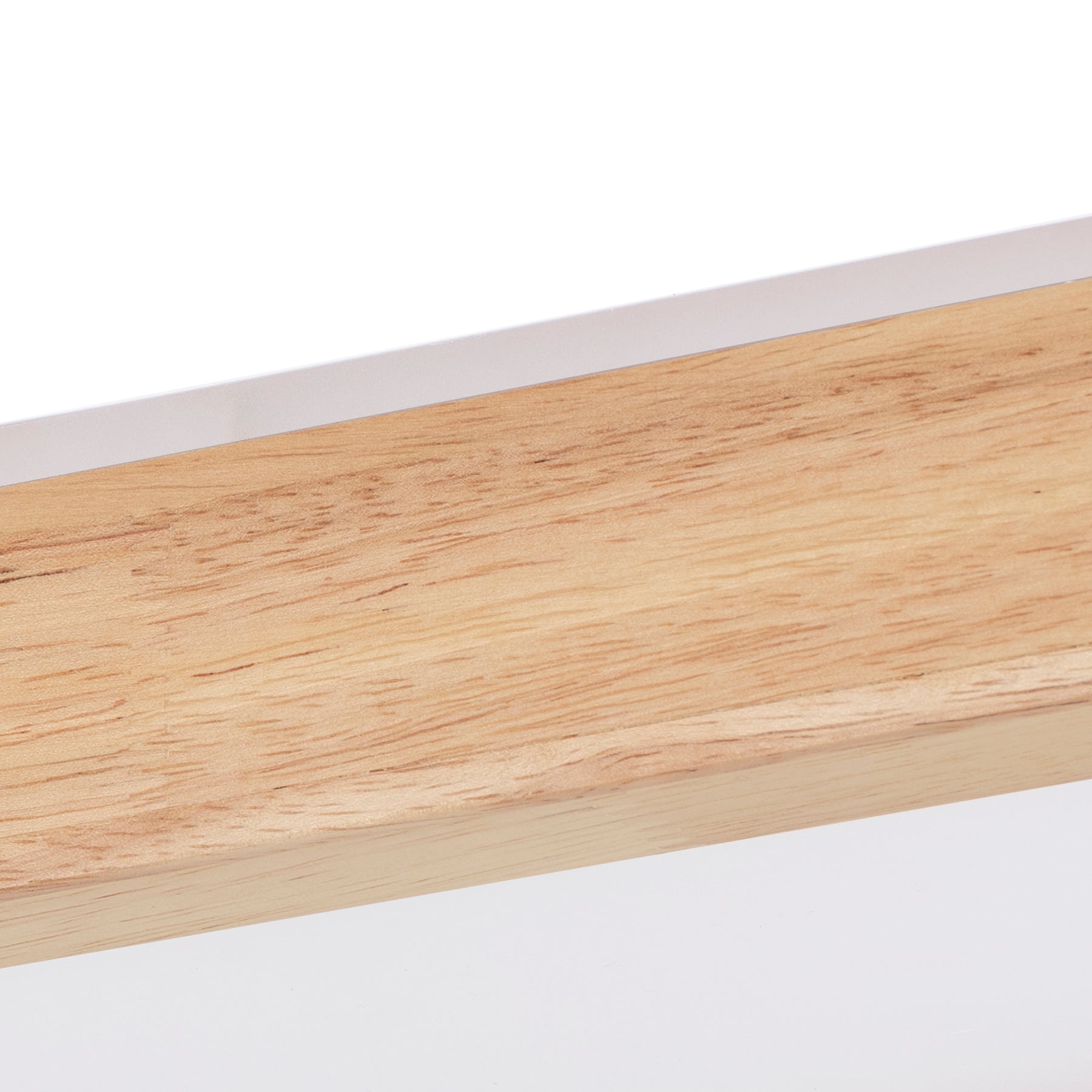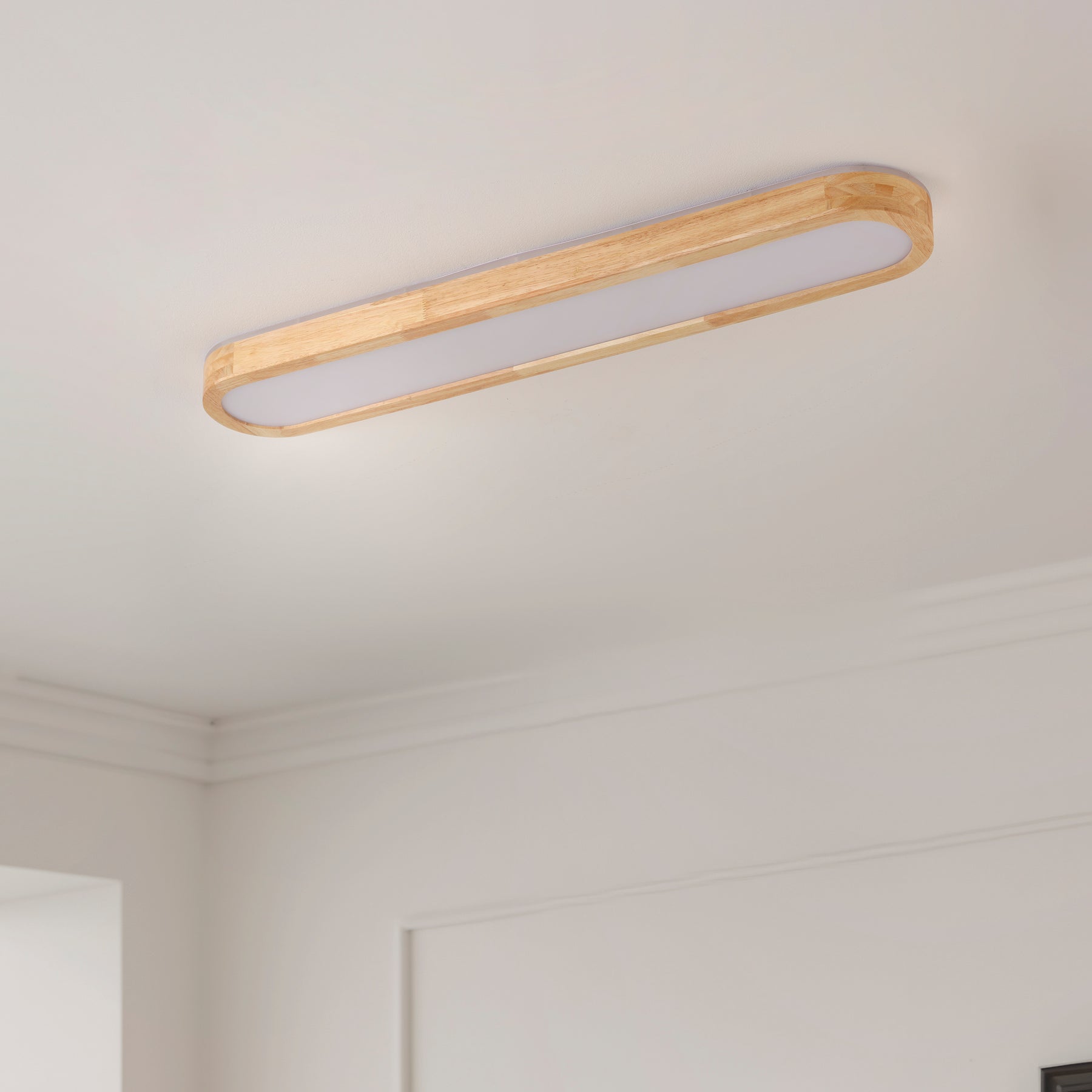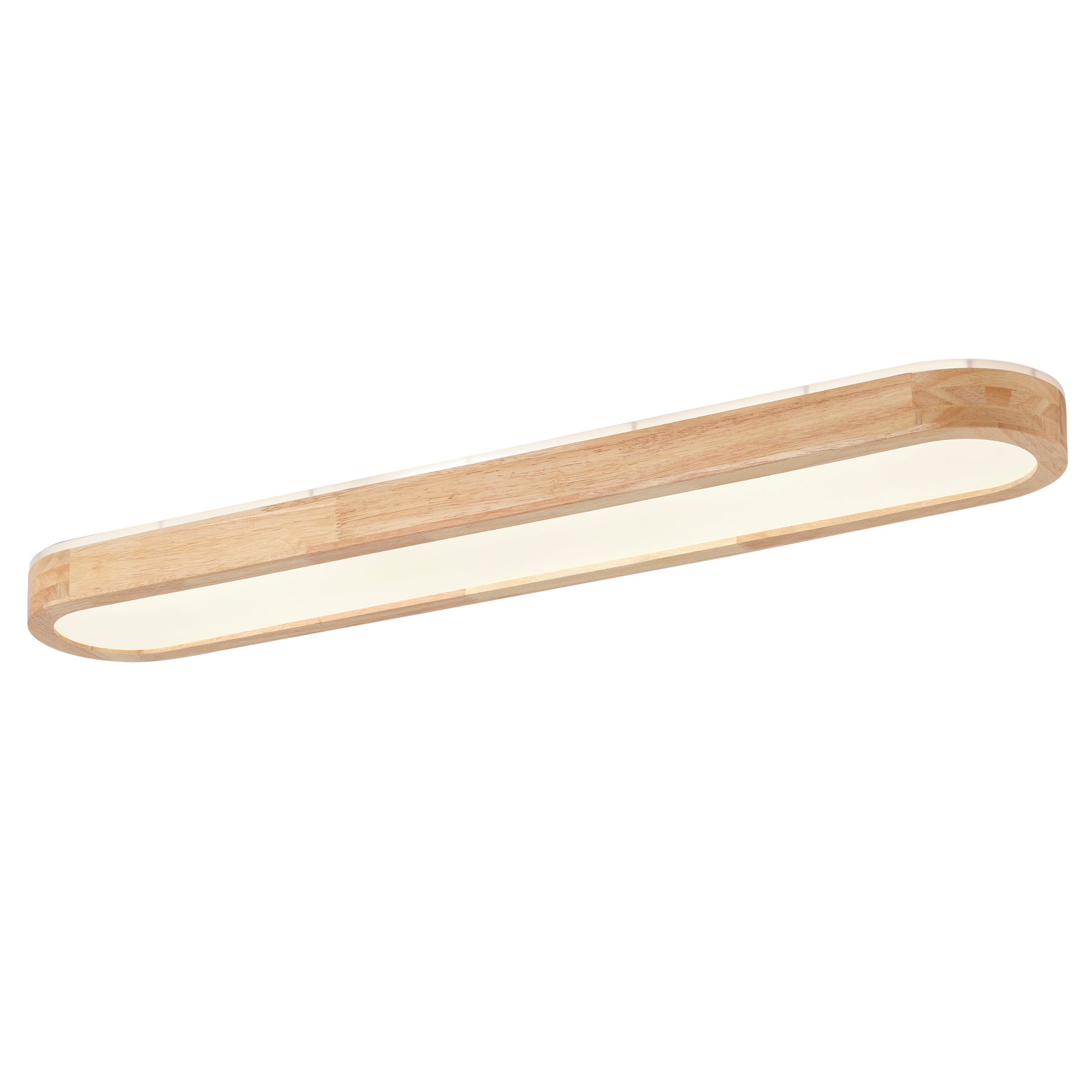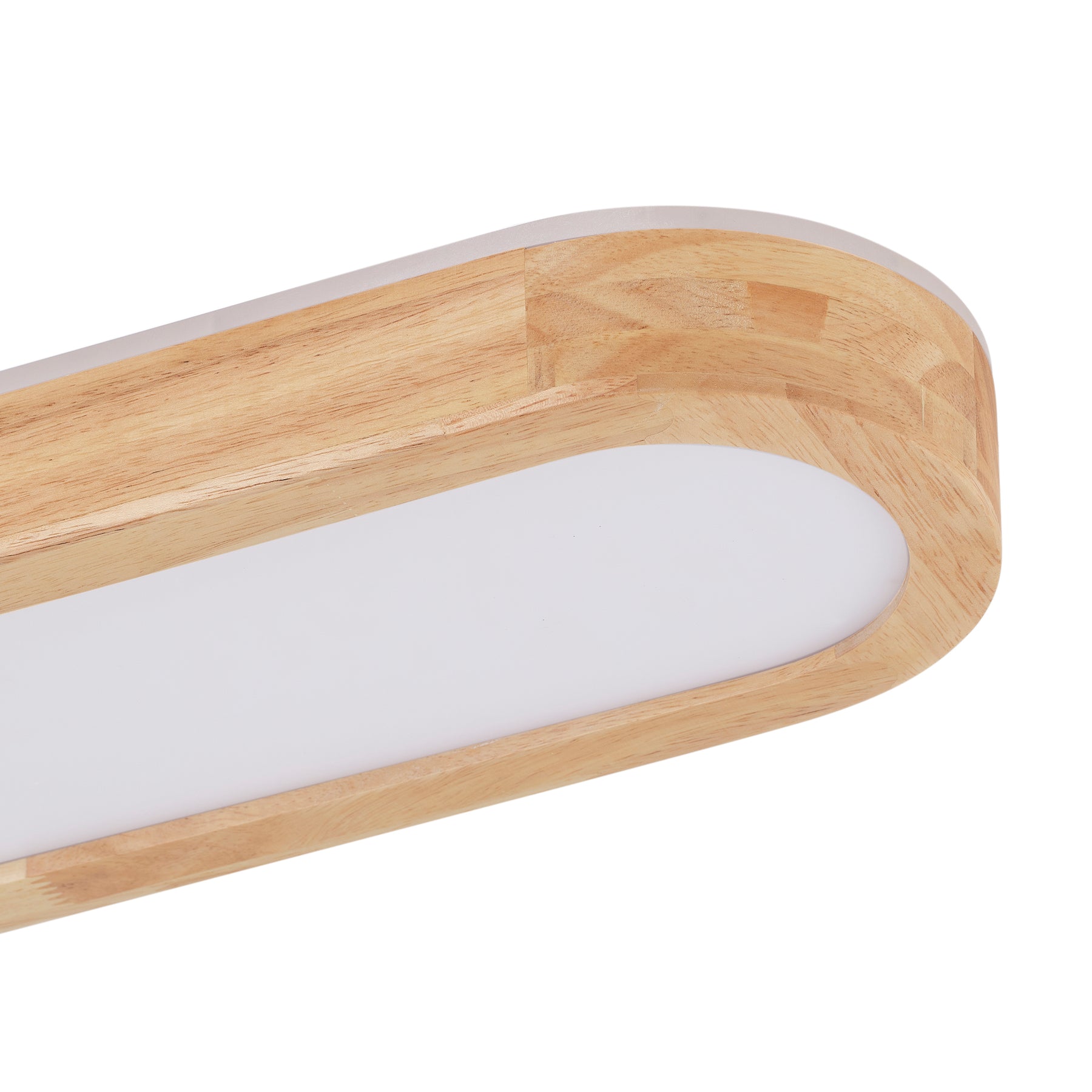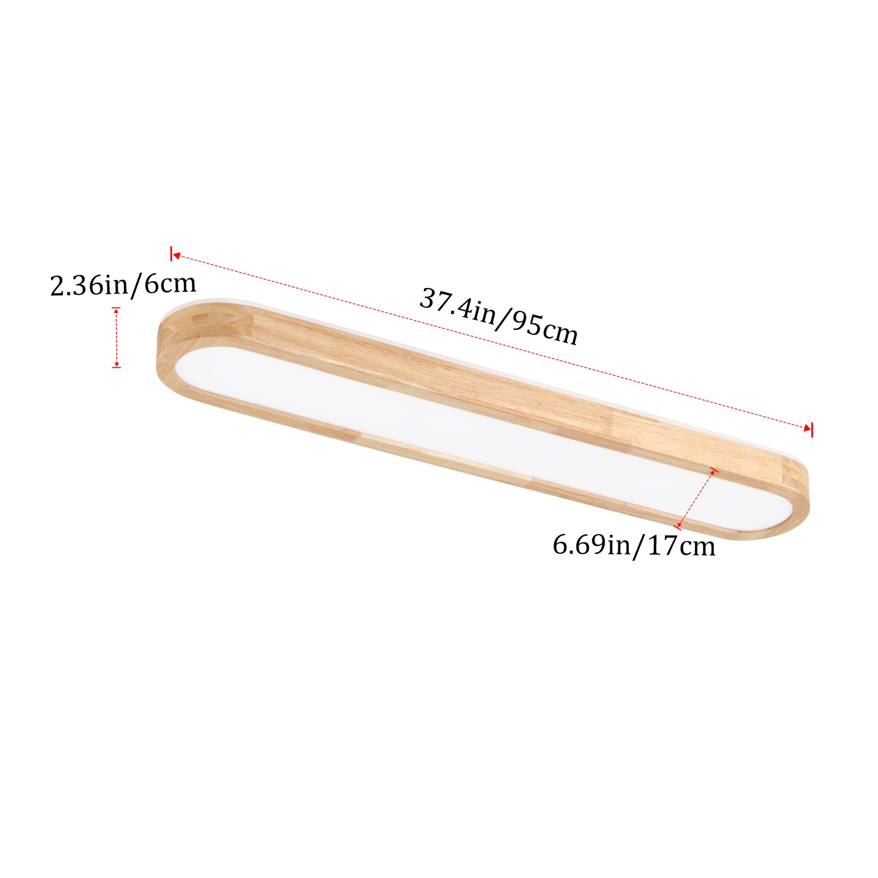 Long oval low profile design. Matte white iron body with wood grain accent, sandblasted acrylic diffuser, and a milky PS shade for soft diffused light.