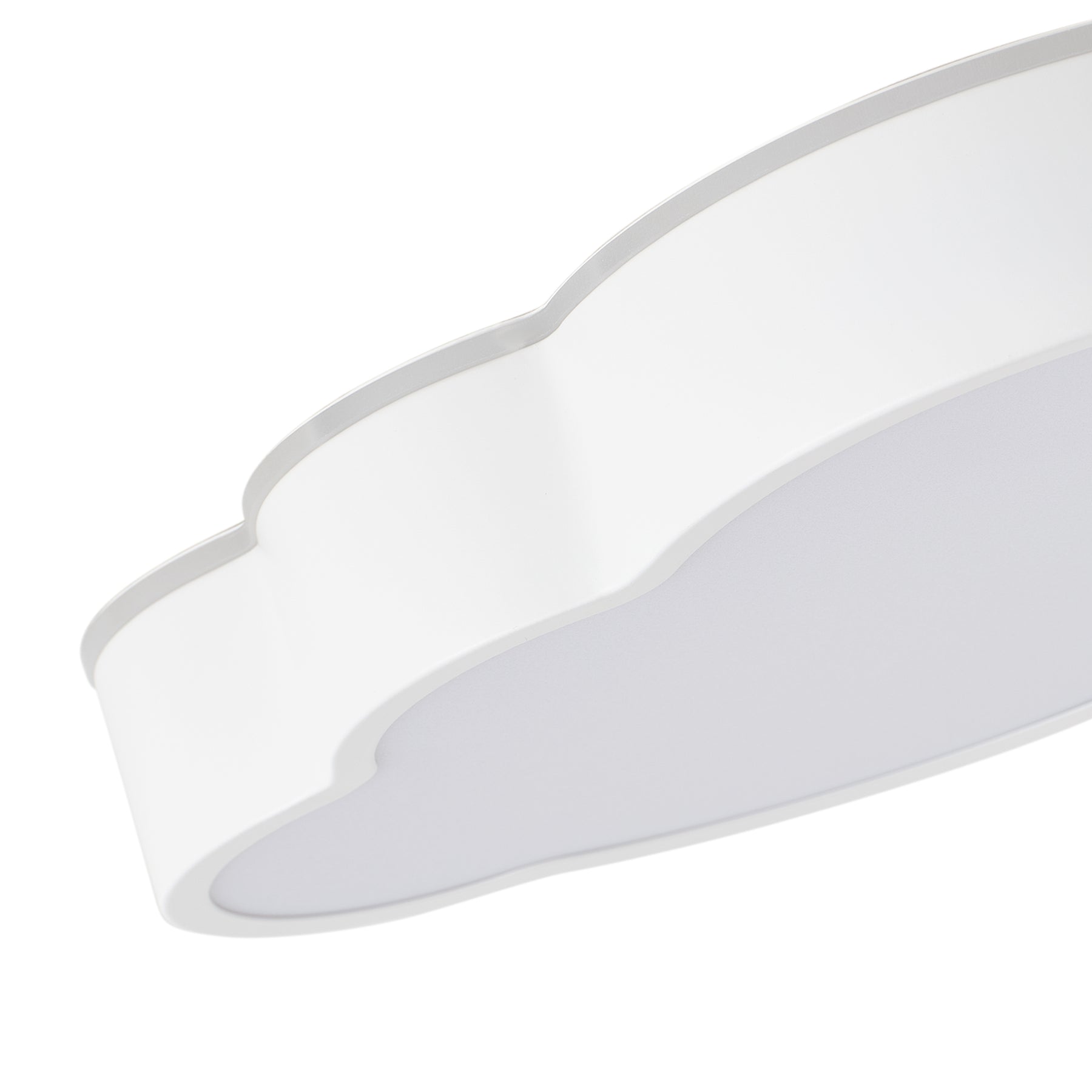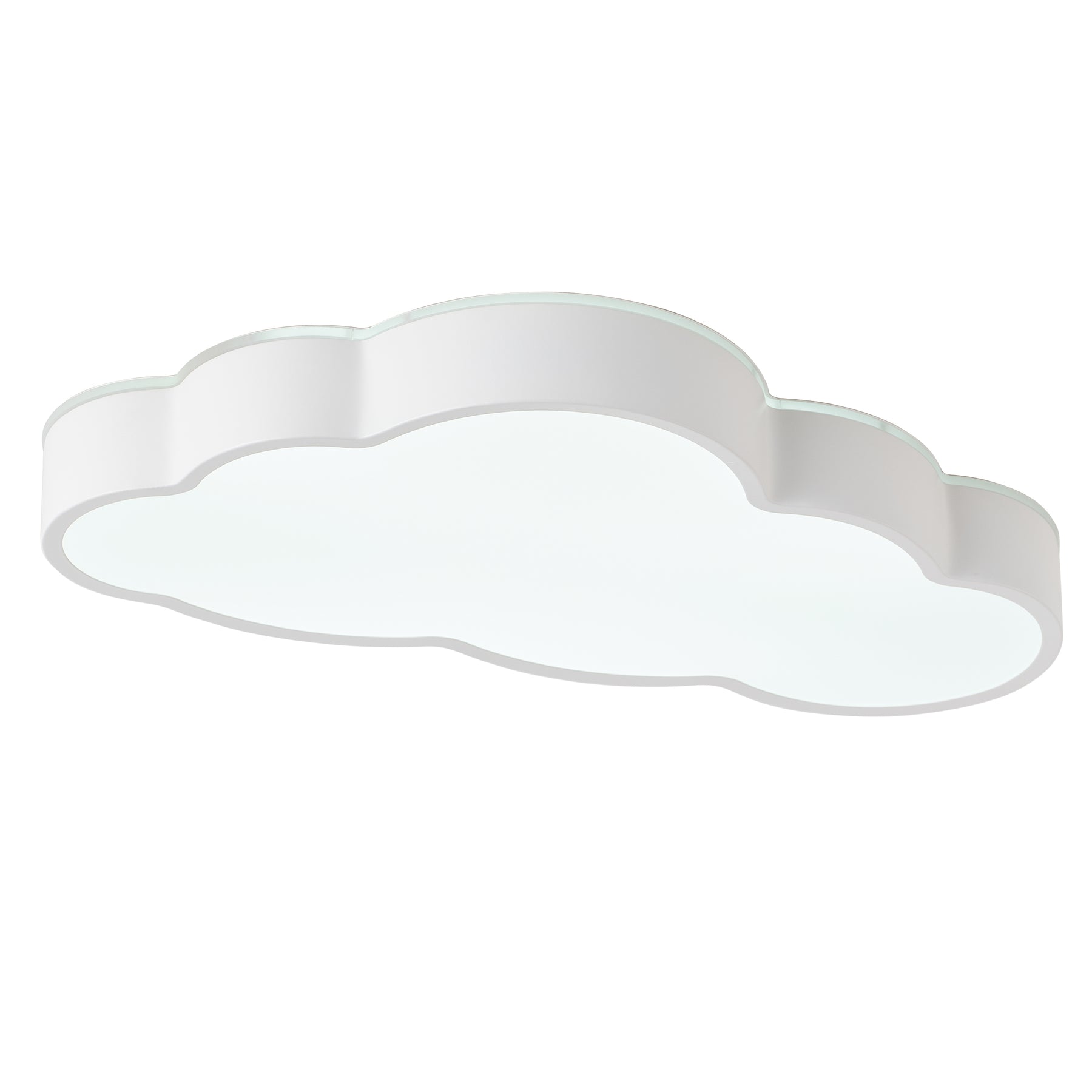 The fixture combines an iron and acrylic body in matte white with frosted acrylic and a milk white PS diffuser to create a soft glowing cloud shape. A ceiling plate with matte white and wood grain accents adds a warm Nordic touch that suits nurseries and kids rooms.
