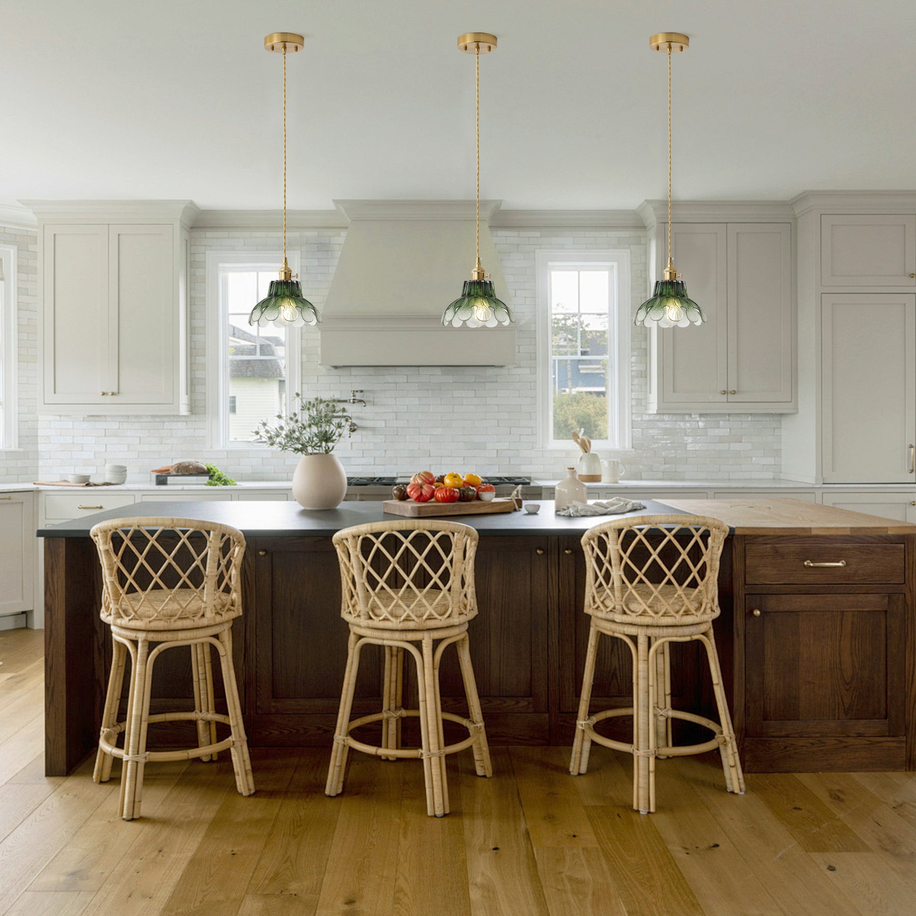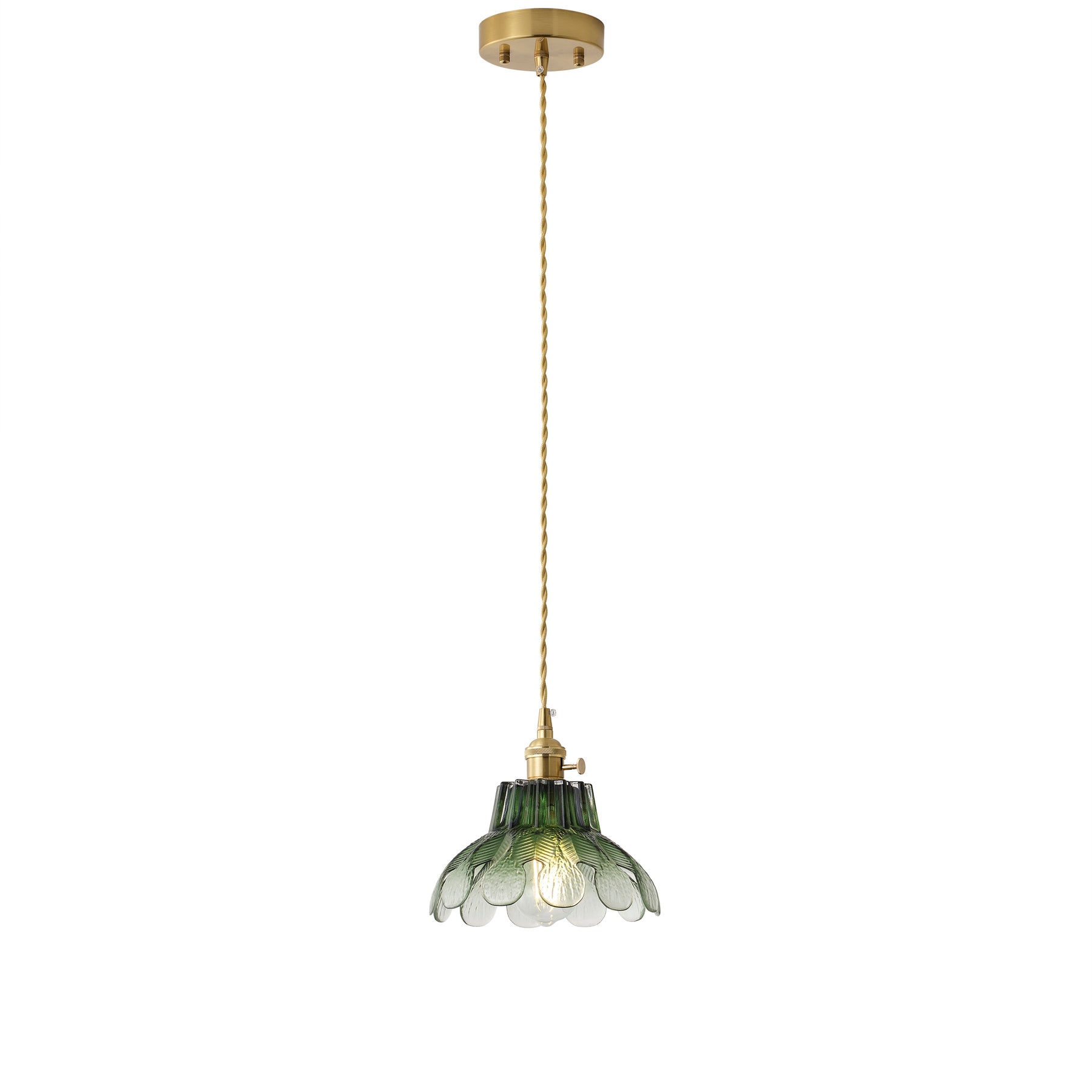This retro single-light pendant features an iron and aluminum body with natural copper-tone electroplating. It includes a matching iron canopy and a gradient glass shade in smoked deep green or golden tea. Uses 1 x E26 bulb, 120V, max 40W, and is ETL listed for safety.