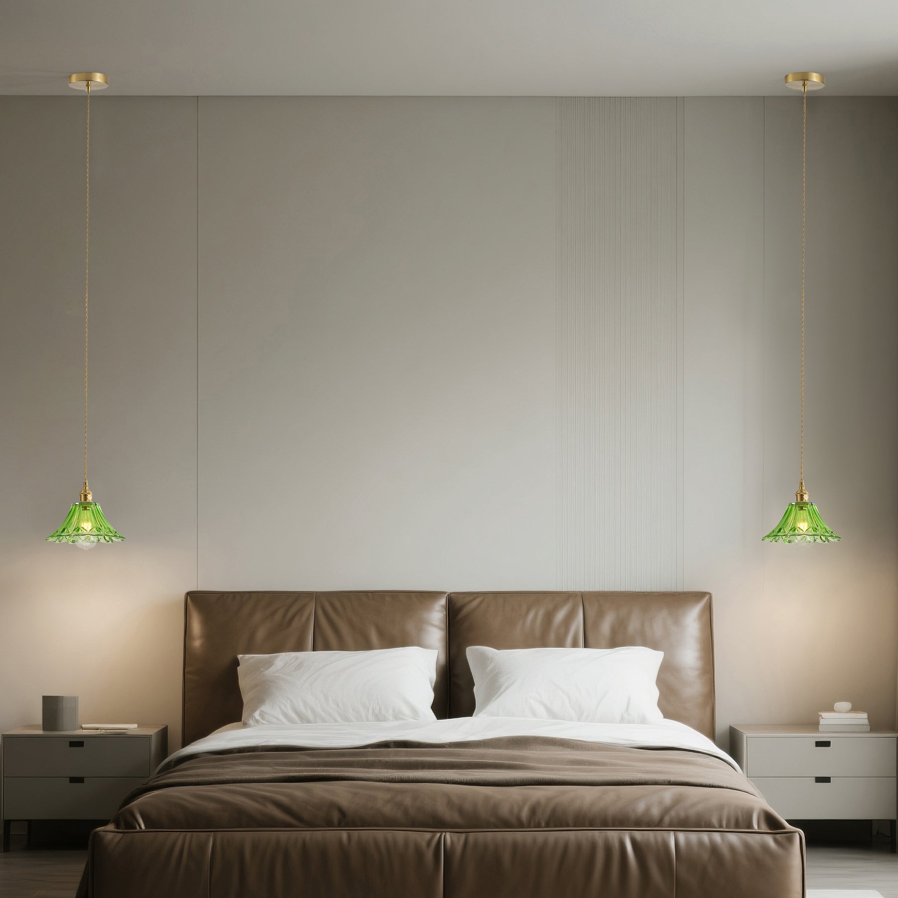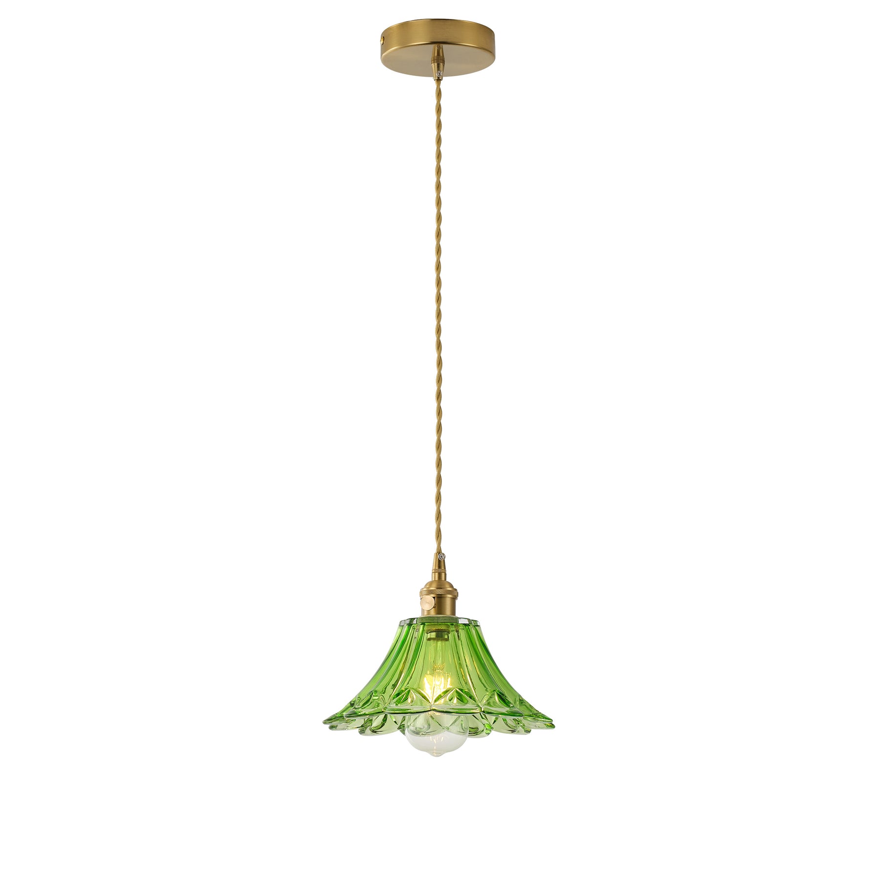 A sculpted light-green glass shade adds a fresh pop of color and softly diffuses light, while the brass-tone metalwork brings a refined vintage/mid-century feel. The slim, adjustable drop keeps the silhouette light and elegant for small or open spaces.
